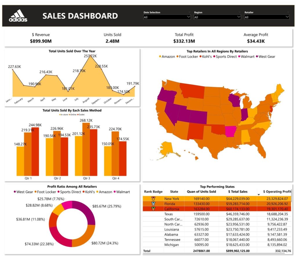 This Power BI dashboard was developed to provide a centralized performance monitoring system for Adidas sales across the United States. The dashboard tracks key KPIs including: